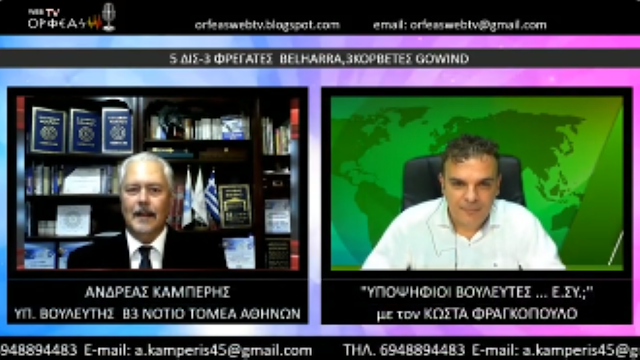 Ο Ανδρέας Καμπέρης, υποψήφιος βουλευτής της ΕΛΛΗΝΩΝ ΣΥΝΕΛΕΥΣΙΣ, στην εκπομπή «ΥΠΟΨΗΦΙΟΙ ΒΟΥΛΕΥΤΕΣ ... Ε.ΣΥ.;», με τον Κώστα Φραγκόπουλο.